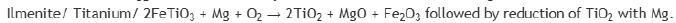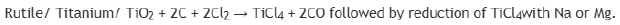 Titanium exists as Ilmenite ore (FeTiO3) and rutile (TiO2) in earths crust. Impure titanium is extracted from it by treating them with Cl2 and C to get TiCl4 which can further be reduced by Na or Mg. The set of chemical process involved are: