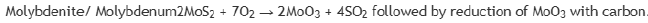Extraction of Mo: Molybdenum is found as its sulfide in the earth's crust. Firstly, the sulfide is converted to oxide by roasting in air at temperature higher than 500oC.