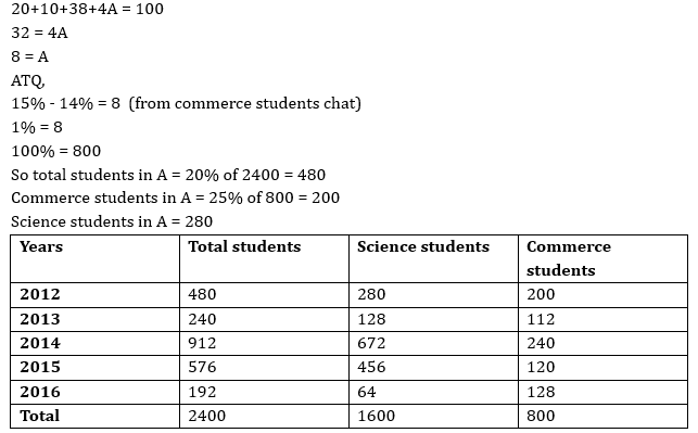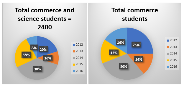 The pie chart given below shows the number of science and commerce student in five different year from 2012 to 2016 and another pie chart shows the percentage of commerce students.