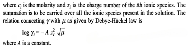 The activity coefficient of the ion depends upon the ionic strength µ of the solution. The latter is defined as
