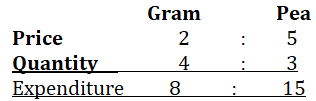 The ratio of the market prices of gram and pea is 2 : 5, and the ratio of the quantities consumed by a family is 4 : 3. Find the ratio of the expenditure on gram to pea.