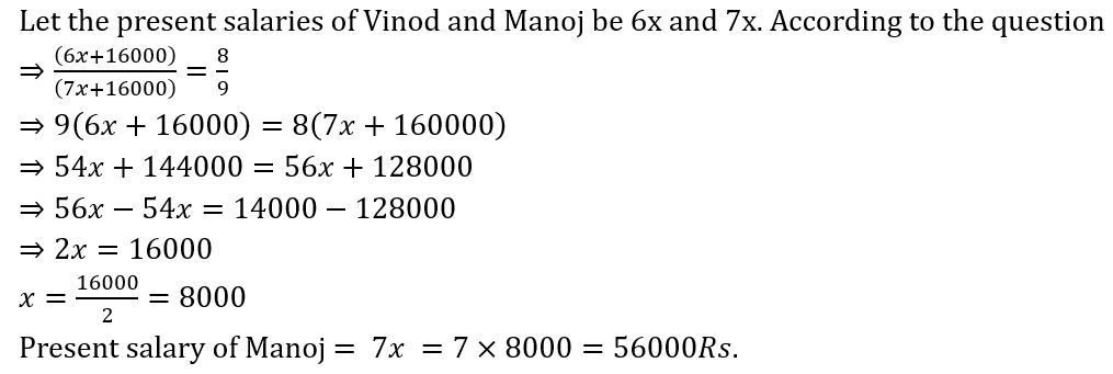 The ratio of the present salaries of Vinod and Manoj is 6 : 7. If both of them get their salaries increases by Rs.16,000, then the ratio becomes 8 : 9