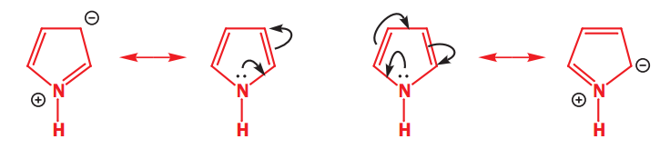 In pyrrole, the nitrogen lone pair is delocalized round the ring. All the delocalization pushes electrons from the nitrogen atom into the ring and we expect the ring to be electron-rich at the expense of the nitrogen atom. The HOMO should go up in energy and the ring become more nucleophilic.