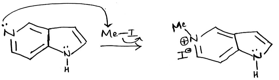 The given fused system comprises of a pyridine ring and a pyrrole ring. In the given fused system, the lone pair on the nitrogen atom (six membered ring) can be donated in the σ* of MeI.