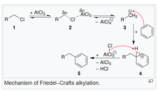 The reaction proceeds through generation of an acylium center. The reaction is completed by deprotonation of the arenium ion by AlCl4-, regenerating the AlCl3 catalyst. However, in contrast to the truly catalytic alkylation reaction, the formed ketone is a moderate Lewis base, which forms a complex with the strong Lewis acid aluminum trichloride. The formation of this complex is typically irreversible under reaction conditions. Thus, a stochiometric quantity of AlCl3 is needed. The complex is destroyed upon aqueous workup to give the desired ketone.