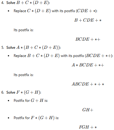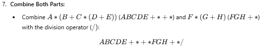 · Operands (e.g., A, B, C) are written in the same order as they appear in the infix expression.
