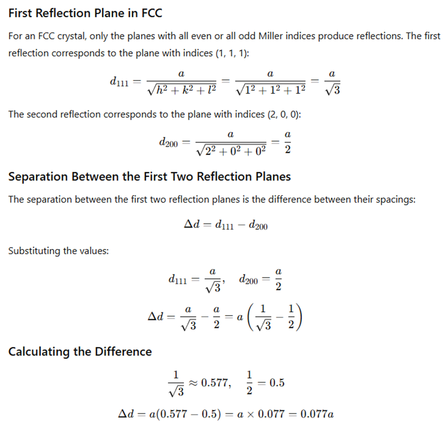In crystallography, the separation between planes in a crystal lattice is determined using Bragg's law and the Miller indices (h, k, l) of the planes. For a face-centered cubic (FCC) crystal, the planes with the lowest Miller indices typically have the smallest spacing, and the spacing between planes is inversely proportional to the square root of the sum of the squares of the Miller indices.