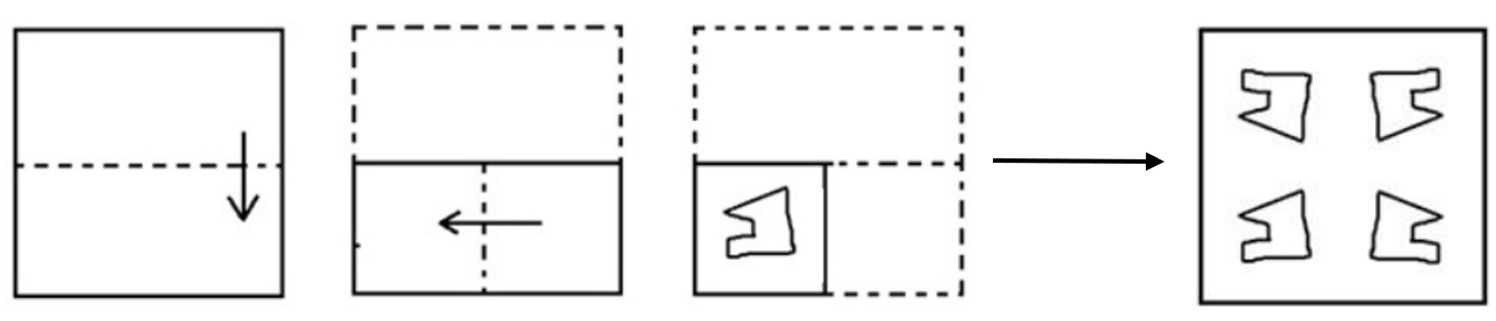 The sequence of folding a piece of paper and the manner in which the folded paper has been cut is shown below. Select the option figure that would most closely resemble the unfolded form of the paper.