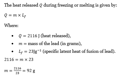 The specific latent heat of fusion of lead is . Find the mass of a piece of lead if it releases 2116 J of heat when it freezes at its freezing point o