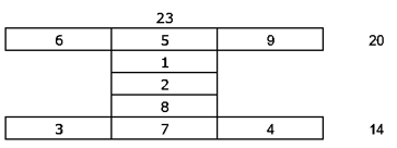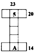 A 3 × 3 grid with numbers 1 to 9 filled without repetition. The top row sums to 20, the bottom row sums to 14, and the column sums to 23. Find the value of A.