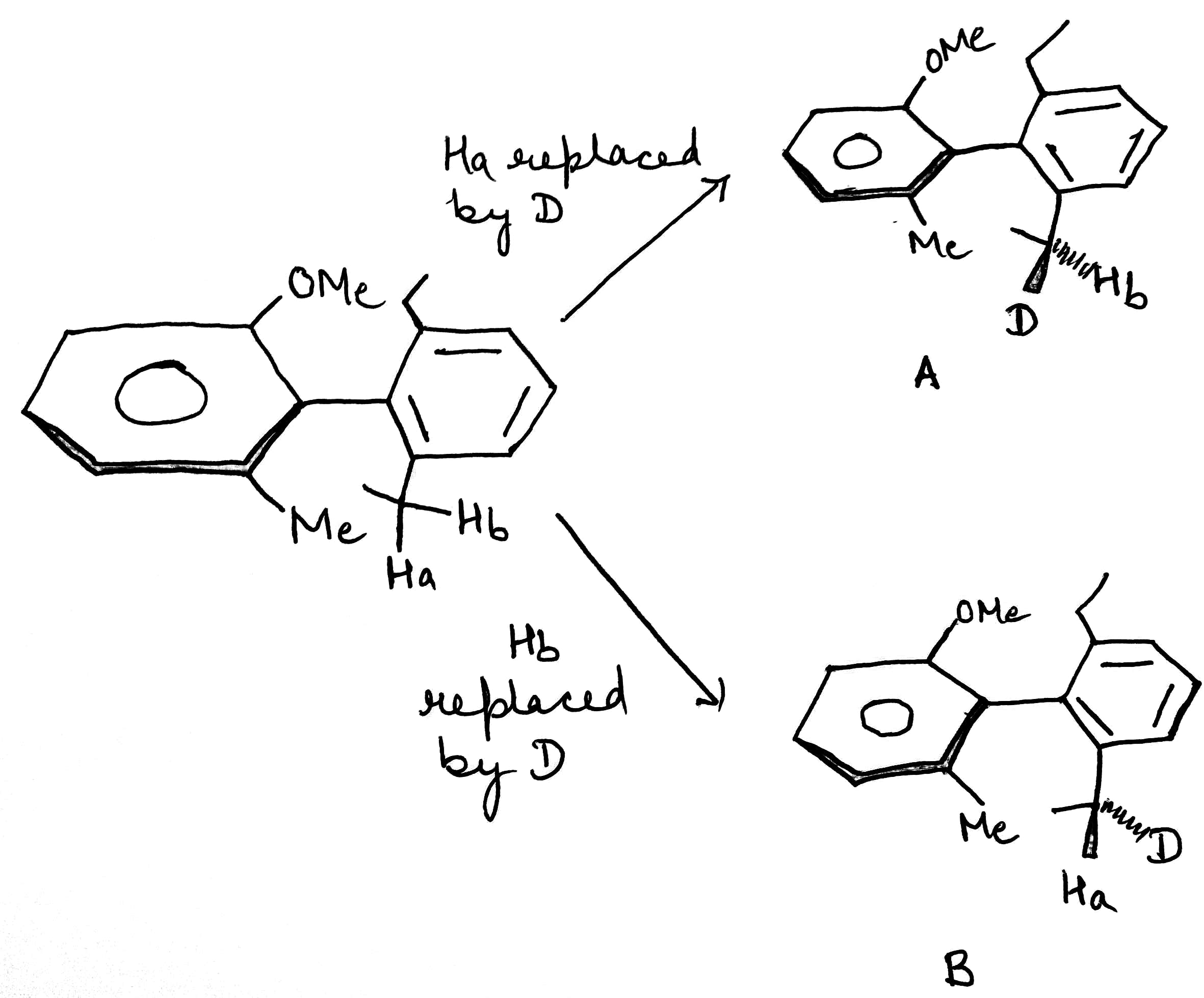 Many molecules contain atoms or groups that appear to be equivalent, but with a close inspection will show to be actually different. We can test whether two atoms are equivalent by replacing each of them in turn with some other atom or group. If the new molecules created by this process are identical, the original atoms are equivalent; otherwise they are not.