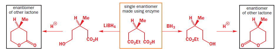Lithium borohydride (LiBH4) is a borohydride and known in organic synthesis as a reducing agent for esters. The enhanced reactivity in many of these cases is attributed to the polarization of the carbonyl substrate by complexation to the lithium cation. Japanese chemists used an enzyme to make a single enantiomer of the acid below, and were able to reduce either the ester or the carboxylic acid by choosing lithium borohydride or borane as their reagent.