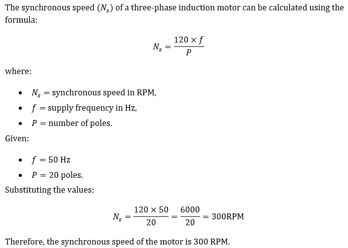 The synchronous speed of a three phase induction motor having 20 poles and connected to a 50 Hz source is-