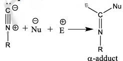 As opposed to most functional groups in organic chemistry, isocyanides react with both nucleophiles and electrophiles at the same carbon. This alpha–adduct forms the basis for all of the subsequent rearrangements and product forming steps.
