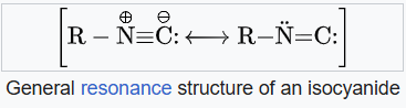 Isocyanides are described by two resonance structures, one with a triple bond between the nitrogen and the carbon and one with a double bond between. The π lone pair of the nitrogen stabilizes the structure and is responsible of the linearity of isocyanides, although the reactivity of isocyanides reflects some carbene character, at least in a formal sense. Thus, both resonance structures are useful representations. They are susceptible to polymerization.