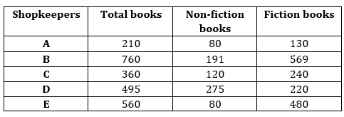 The table shows the total books (fiction + non – fiction) sold by five shopkeepers.