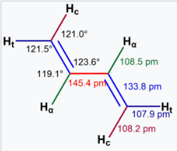 The gauche geometry, in which the double bonds of the s-cis geometry are twisted to give a dihedral angle of around 38°, is a second conformer that is around 12.0 kJ/mol (2.9 kcal/mol) higher in energy than the s-trans conformer. Overall, there is a barrier of 24.8 kJ/mol (5.9 kcal/mol) for isomerization between the two conformers. This increased rotational barrier and strong overall preference for a near-planar geometry is evidence for a delocalized π system and a small degree of partial double bond character in the C–C single bond, in accord with resonance theory.