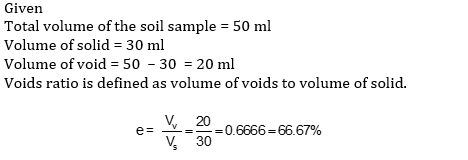 The total volume of the soil sample is 50 ml. Find the void ratio if the volume of solids is 30 ml.