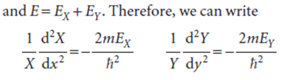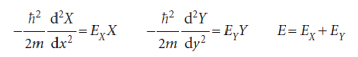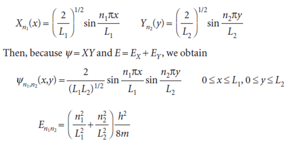 We consider a two-dimensional version of the particle in a box. The particle is confined to a rectangular surface of length L1 in the x-direction and L2 in the y-direction; the potential energy is zero everywhere except at the walls, where it is infinite. The wavefunction is now a function of both x and y and the Schrödinger equation is