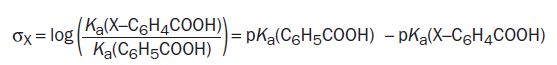 What we would ideally like to do is find a way to quantify the effects that electron-donating or -withdrawing groups have on the transition state or intermediate during the course of a reaction. This will then give us an idea of what the transition state is really like. The first question is: can we define exactly how efficient a given group is at donating or withdrawing electrons? Hammett took the arbitrary decision to use the pKa of an acid as a guide.