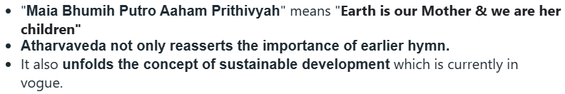 The veneration _______ in Atharwveda not only reasserts the importance of earlier hymn, it also unfolds the concept of sustainable development which is currently in vogue.