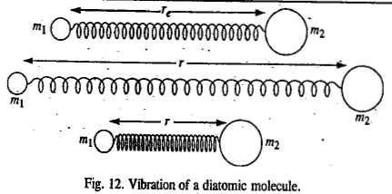 In the case of a diatomic molecule, the masses m1 and m2 vibrate back and forth relative to their centre of mass in opposite directions