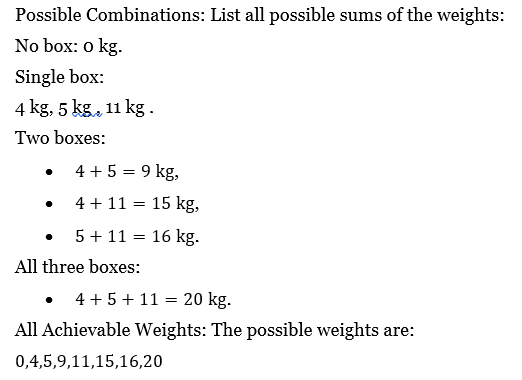 The weights of 3 boxes are 4, 5 & 11 kilograms. Which of the following CANNOT be the total weight, in kilograms, of combination of these boxes?