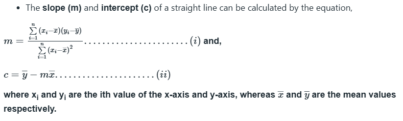 The equation of a straight line is y=mx+c, where, m is the gradient and c is the height at which the line crosses the y-axis, also known as the y-intercept.