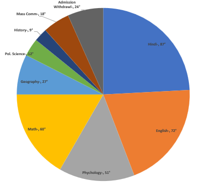 There are 1800 students in a college. The given pie-chart represents (in degrees) the number of students studying various subjects. Study the chart and answer the question below it.