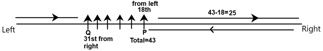 There are 43 cadets in a battalion, and the commander is planning for an straight row arrangement of cadets on stage, facing north. P is 18th from the left side of the tow and Q is 31st from the right side of the row. Find the number of cadets standing between P and Q.
