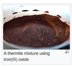 Red iron (III) oxide (Fe2O3, commonly known as rust) is the most common iron oxide used in thermite. Black iron (II, III) oxide (Fe3O4, magnetite) also works. Other oxides are occasionally used, such as MnO 2 in manganese thermite, Cr 2 O 3 in chromium thermite, SiO2 (quartz) in silicon thermite, or copper(II) oxide in copper thermite, but only for specialized purposes. All of these examples use aluminium as the reactive metal.