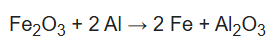 The products are aluminium oxide, elemental iron, and a large amount of heat. The reactants are commonly powdered and mixed with a binder to keep the material solid and prevent separation.