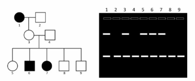 The co-dominance of the DNA marker is suggested by the pedigree analysis, as both alleles (represented by different fragments in the individuals' DNA) show clear inheritance patterns linked to the skin color trait. The marker shows both bands (in the individuals) associated with spotted skin color.