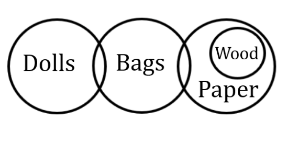(I): All dolls are paper (False, the whole area of dolls is not inside the area of paper.)