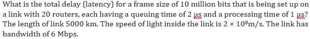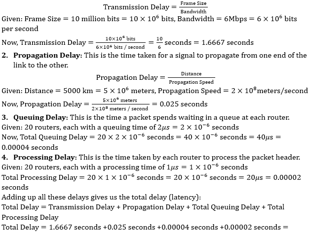 To calculate the total delay (latency) for the given scenario, we need to consider four types of delays: