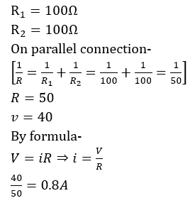Two 100-Ω resistors are connected in parallel, and this combination is connected across a 40-V supply. Find the current supplied by the voltage source
