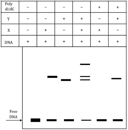Lane 4 (DNA + X + Y): Two distinct shifts are seen, representing X-DNA and Y-DNA complexes, suggesting both proteins bind DNA, but separately.