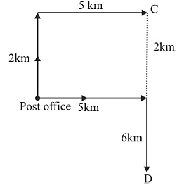 Two postmen, C and D, start walking from a post office. C walks 2 km north, then turns to his right and walks 5 km. Meanwhile D walks 5 km East, turns