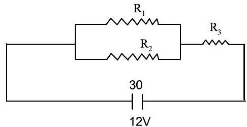 Correct option is CR1=20Ω,R2=30Ω1R=1R1+1R2=120+130=560=112ΩR=12ΩR3=8ΩR=8+12=20ΩV=iRi=1220=>0.6 AVoltage drop across 12 Ohm is =12×0.6=7.2 VCurrent in 20Ω resistor=7.220=0.36=0.36 AR_1 = 20\Omega, \quad R_2 = 30\Omega\\\frac{1}{R} = \frac{1}{R_1} + \frac{1}{R_2} = \frac{1}{20} + \frac{1}{30} = \frac{5}{60} = \frac{1}{12} \Omega\\R = 12\Omega\\R_3 = 8\Omega\\R = 8 + 12 = 20\Omega\\V = iR\\i = \frac{12}{20} \Rightarrow 0.6 \text{ A}\\\text{Voltage drop across 12 Ohm is } = 12 \times 0.6 = 7.2 \text{ V}\\\text{Current in 20}\Omega \text{ resistor} = \frac{7.2}{20} = 0.36\\= 0.36 \text{ A}R1=20Ω,R2=30ΩR1=R11+R21=201+301=605=121ΩR=12ΩR3=8ΩR=8+12=20ΩV=iRi=2012=>0.6 AVoltage drop across 12 Ohm is =12×0.6=7.2 VCurrent in 20Ω resistor=207.2=0.36=0.36 A