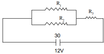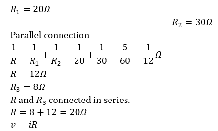 Two resistors, one of 20Ω and the other of 30Ω, are connected in parallel. This combination is connected in series with an 8-Ω resistor and a 12-V bat