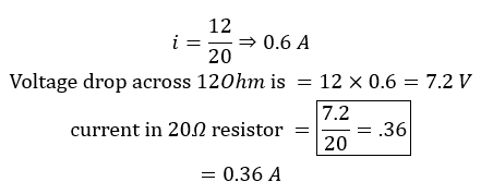 Two resistors, one of 20Ω and the other of 30Ω, are connected in parallel. This combination is connected in series with an 8-Ω resistor and a 12-V battery. The current through the 20-Ω resistor is :