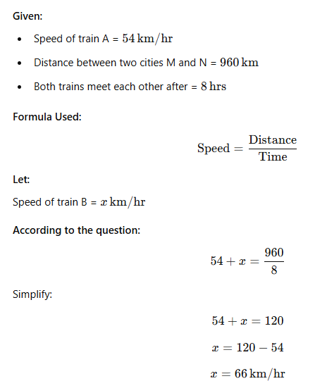 Two trains start at the same time. Train A travelling at an average speed of 54 km/h goes from city M to city N, while Train B goes from city N to cit