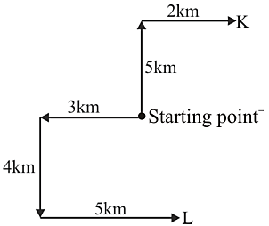 Two workers K and L start walking from the same point. K walks 5 km North, then turns right and walks 2 km. Meanwhile, L walks 3 km West, then turns South and walks 4 km.