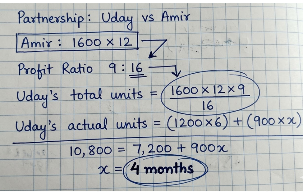 Amir invested Rs. 1600 for whole year and Uday invested Rs. 1200 for first six months and withdraw 1/4thth of his capital and invested remaining amount for next ‘x’ month