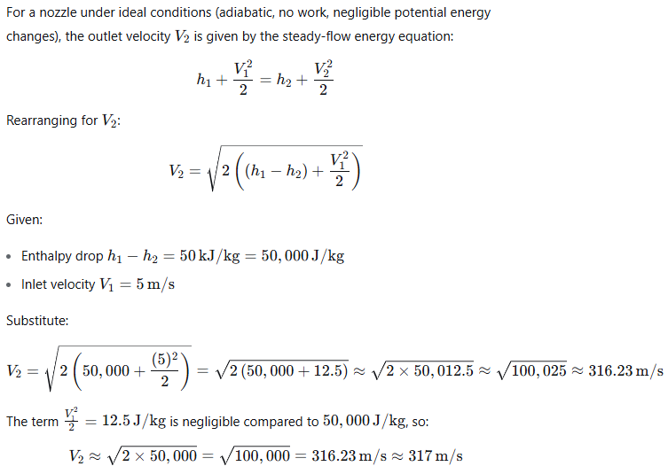 Under ideal conditions, for a drop of 50 kJ/kg enthalpy, what will be the approximate velocity of steam at the outlet of the nozzle if the inlet velocity of the steam is 5 m/s?