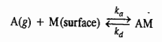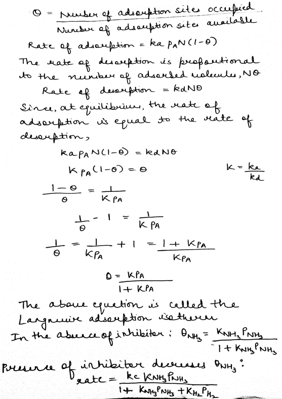 where ka and kd are the rate constants for adsorption and desorption, respectively. The rate of adsorption is proportional to the pressure of A, viz., PA and the number of vacant sites on the surface, viz., N(1-ϴ) where N is the total number of sites and ϴ is the fraction of surface sites occupied by the gas molecules, i.e.