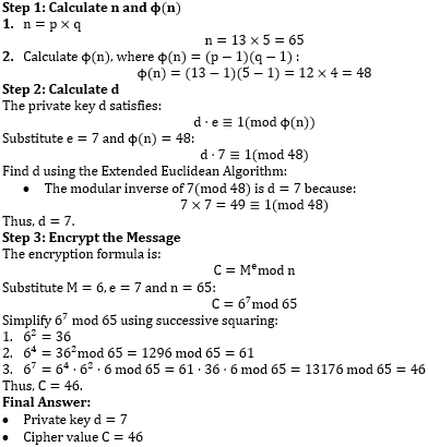 2. The cipher value of M = 6 using the public key (e, n).