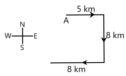 Aman is facing south east and move 5 m forward, turns right and move 5 m and again turns right and move 5 m. Which direction is he from his initial position?