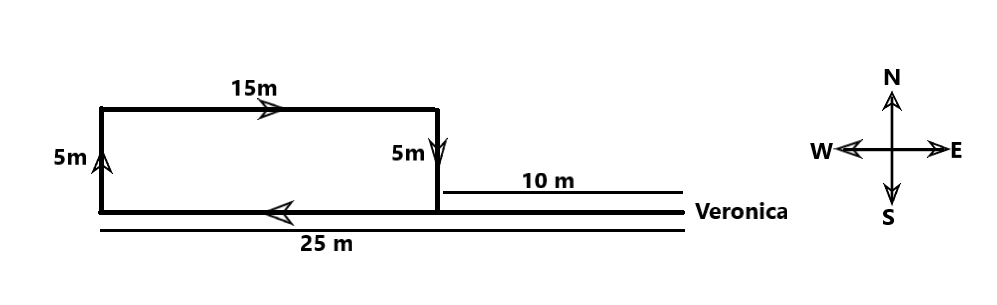 Veronica started from a point and walked 25 m towards the west, she then turned right and walked for 5 m. From there she turned right and walked for 15 m, turned right again, and walked for 5 m. Which side should she tum now and how much distance should she walk for in order to reach the starting point? (All turns are 90 degree turns only)