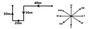 Vijay walks 40 m towards west, then turns left and walks 30 m. Then he turns right and walks 20 m. Finally he turns right and walks 30 m. How far is he from his starting point now?